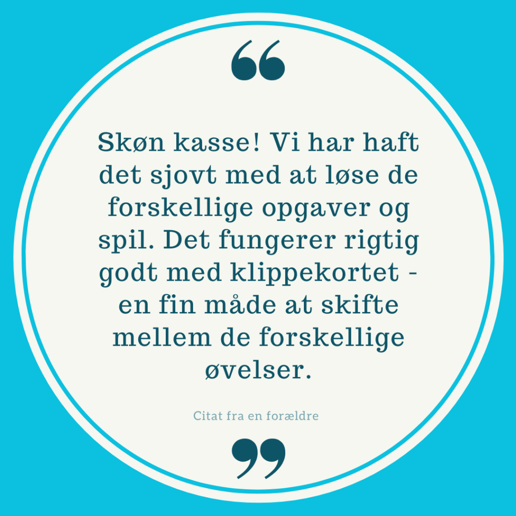 Som motivation for barnet, kan I med fordel printe et ”klippekort”, hvor en aktivitet kan krydses af, når den er gennemført. Der er plads til at sætte et kryds indenfor hvert tema, eller I kan sætte kryds hver gang en aktivitet tages uafhængig om temaet er taget.