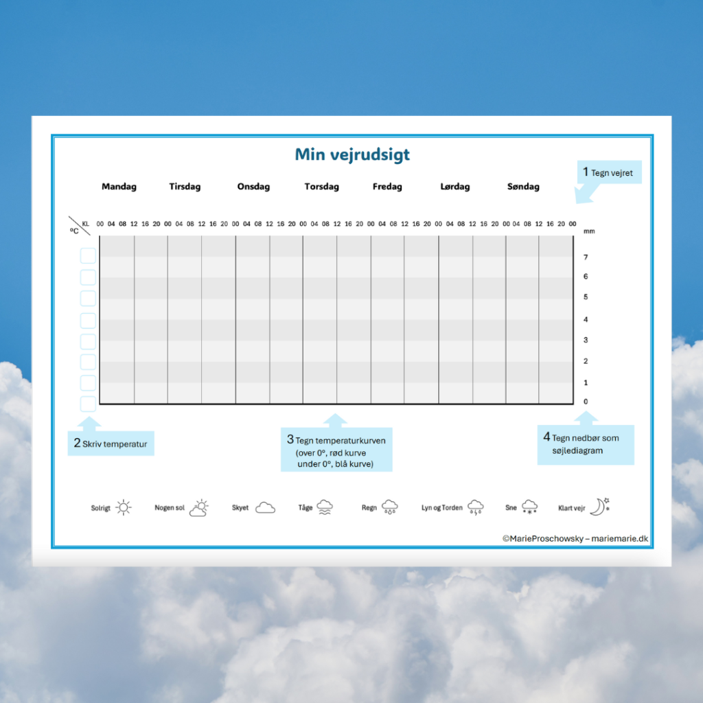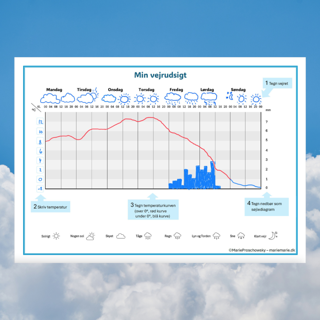 - Skriv temperaturen. Eleverne skriver den temperatur skala der passer til deres drømmevejrudsigt. Elsker de sommer, skal den nok starte på fx 10 grader.