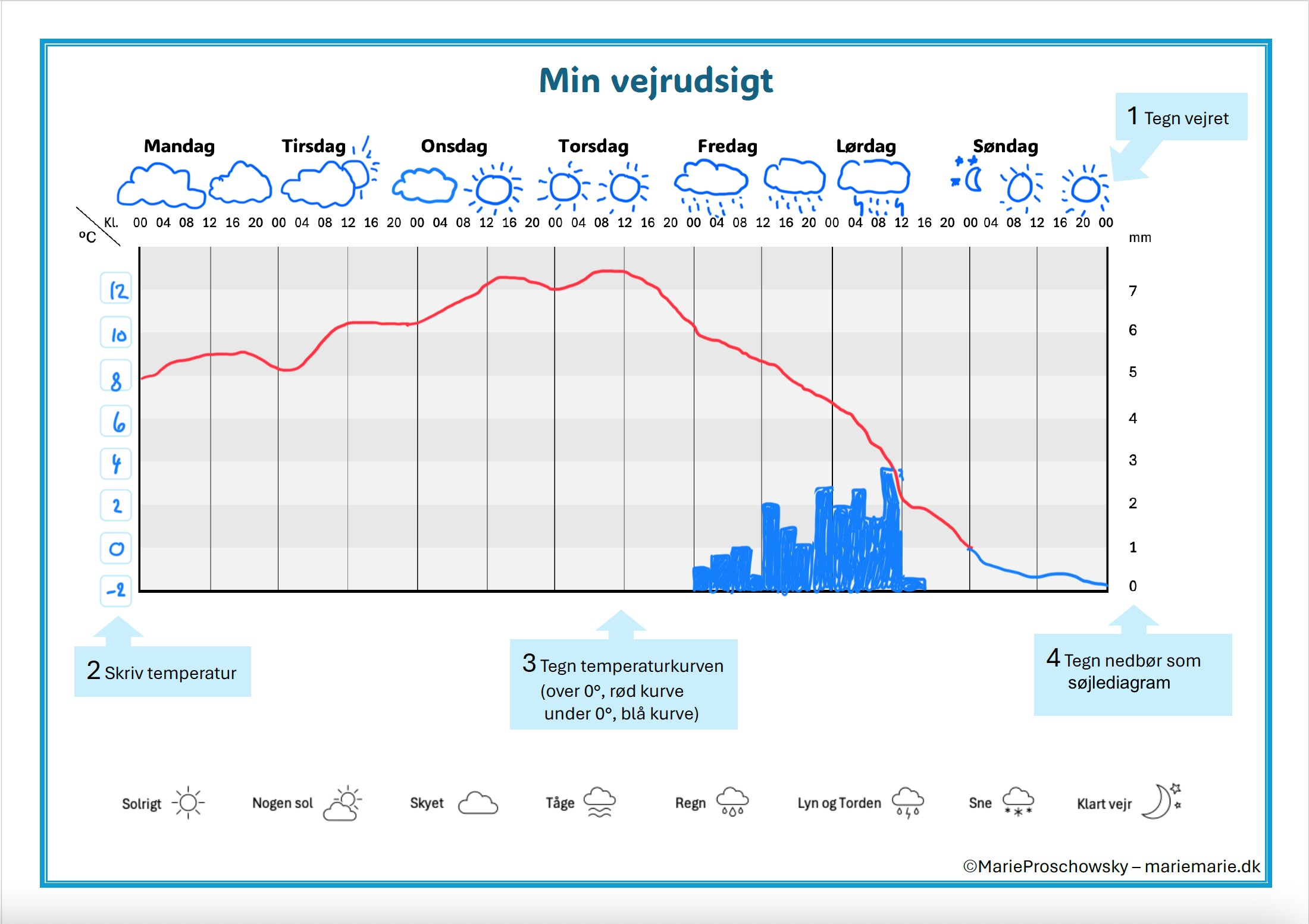 - Tegn vejret. Eleverne skal først tegne de forskellige vejrsymboler under ugedagene. Symbolerne vises nederst på arket, som inspiration til hvilke der kan tegnes.
